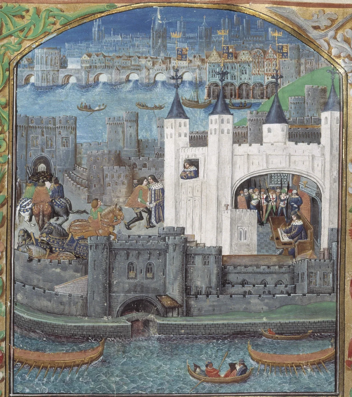 A depiction of the Tower of London from the 1400s. The original manuscript containing this image is at the British Library.